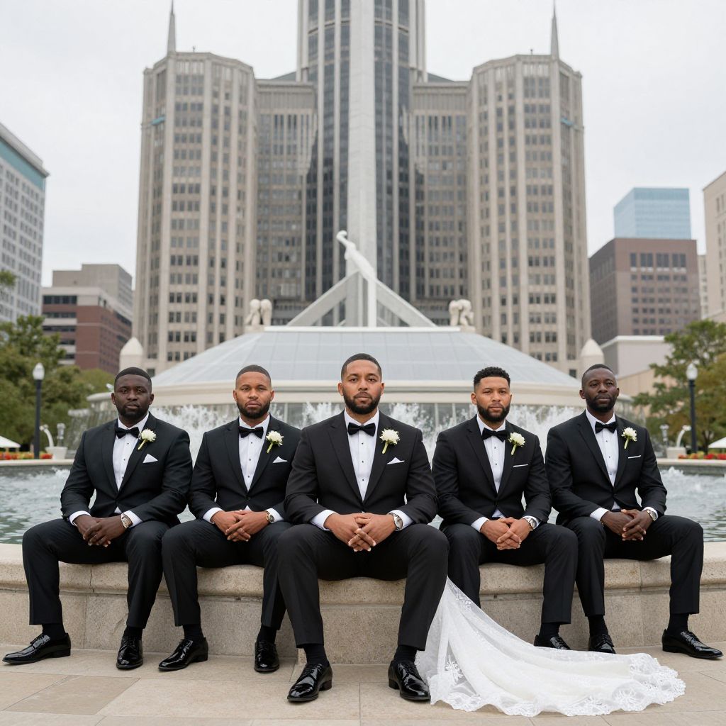 Photograph of four African-American men sitting in a row on a stone ledge in front of a large fountain in a city plaza. They are all wearing black tuxedos with white bow ties and white rose boutonnieres. The man on the far left has a short, neatly trimmed beard and close-cropped hair. The second man has a medium beard and short hair. The third man is clean-shaven with short hair, and the fourth man has a beard and short hair. A white lace dress is partially visible on the ground in front of them. Tall buildings with a distinctive skyscraper and fountain in the background.