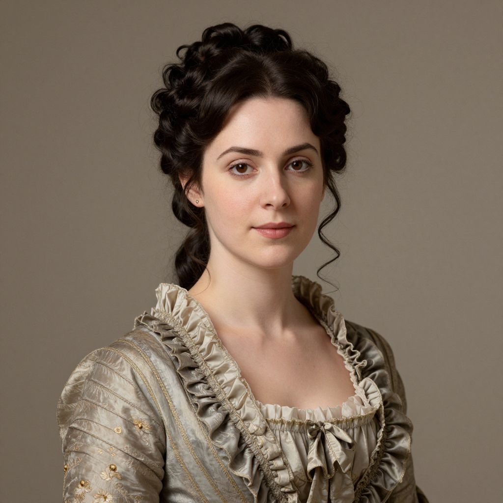 A classical portrait rendered in a realistic style, featuring a woman with dark, intricately styled hair, adorned in an elegant, vintage dress with ruffled detailing, evoking the refined aesthetic of the Regency era, reminiscent of Jane Austen's time period.