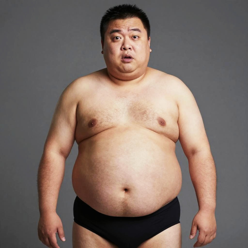 Photograph of a chubby, middle-aged Asian man with short black hair, wearing black underwear, standing against a plain gray background.