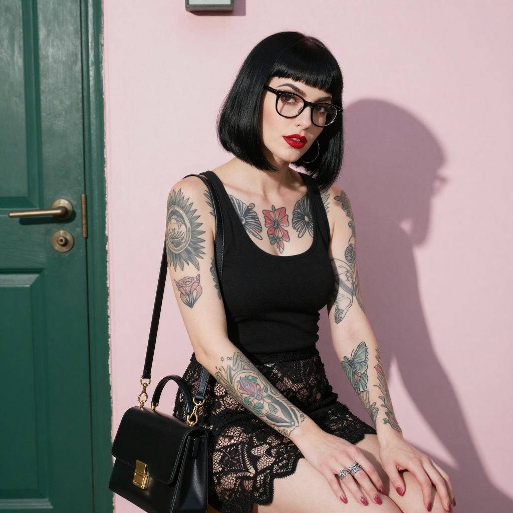 Photograph of a woman with pale skin, black straight hair with bangs, and red lipstick. She wears a red and white checkered long-sleeve shirt and a black skirt, sitting on the floor with her hands on her lap. Her legs, visible below the skirt, are adorned with colorful tattoos. She smiles at the camera against a plain white background.