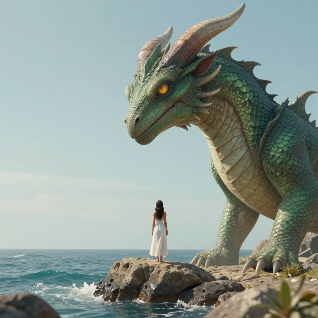 A surreal 3D-rendered scene captures a serene yet otherworldly moment where a woman in a flowing white dress stands on a rocky outcrop by the sea, facing a massive, mythical creature with green scales, sharp horns, and piercing orange eyes, embodying the quiet tension of an island where silence holds weight and whispers carry the loudest truths.