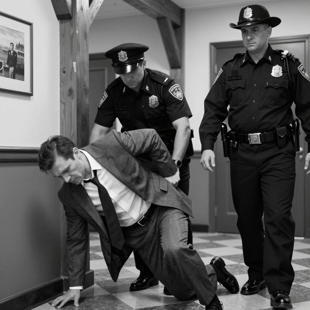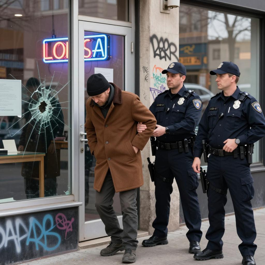 Photograph of three men outside a graffiti-covered storefront. Two police officers in dark uniforms stand to the right, one with a cap, gripping a man in a brown coat and black hat by the arm. The man in the brown coat is being pulled away from the glass window. The window displays broken glass and neon signs. The setting is urban. The officer's expressions are stern. The man being grabbed looks downwards.