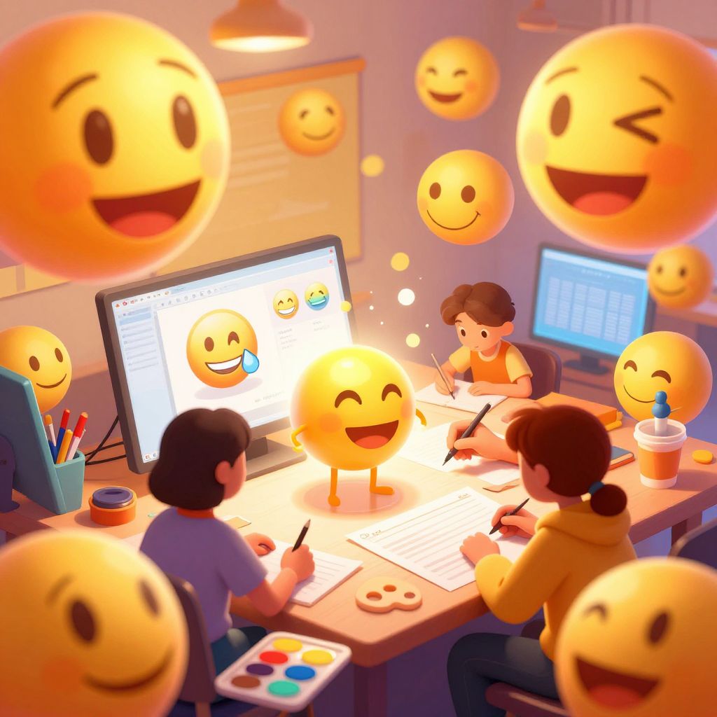 Emoji maker free concept art portraying a whimsical animation studio where designers create unique emojis, surrounded by giant emoji faces, paint palettes, and creative tools, depicted with vibrant colors, dynamic lighting, and a playful artistic vibe.