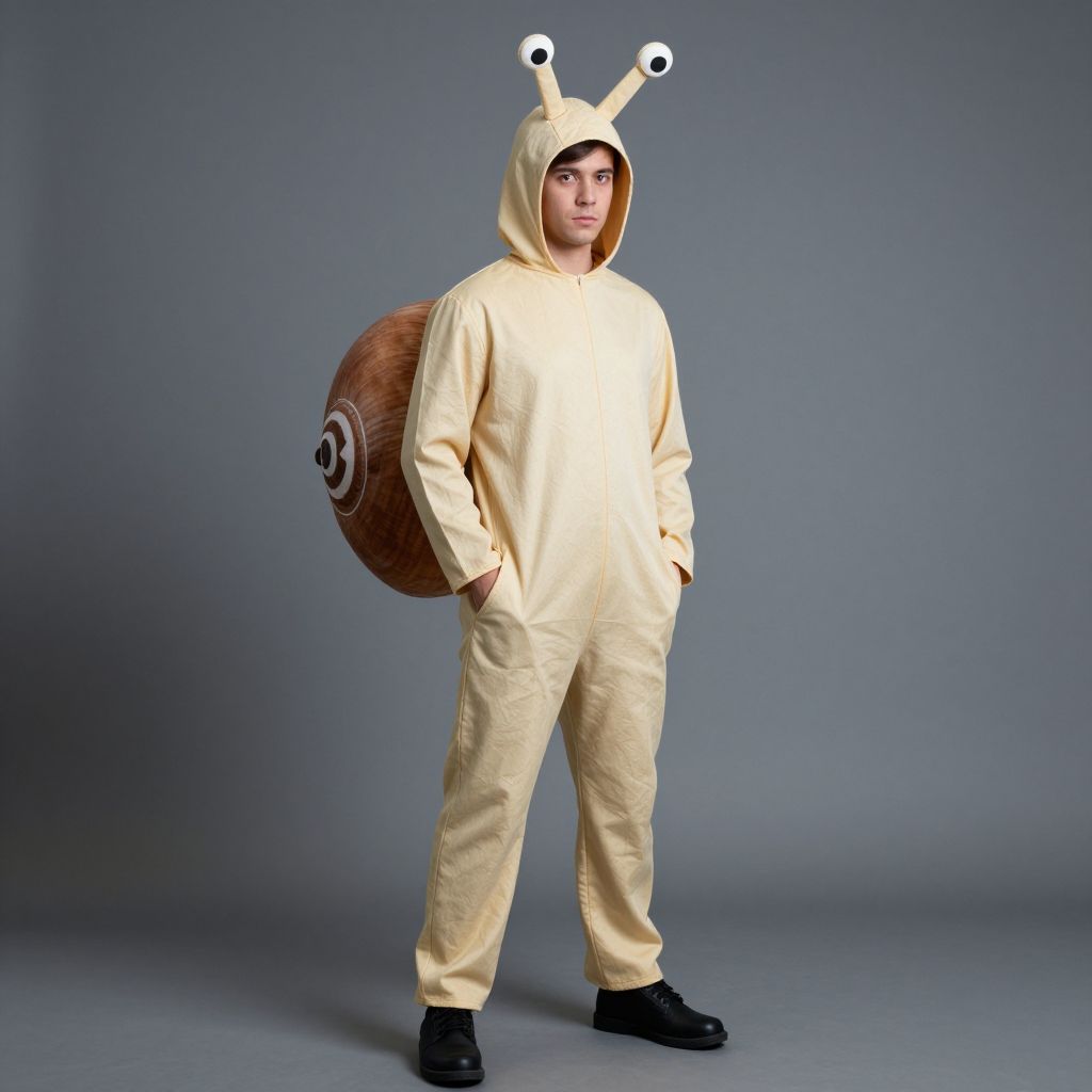 Adult snail costume, solo, 1boy, male focus, full body, antennae, standing, hands in pockets, grey background, black footwear, cosplay, looking at viewer, parody, realistic