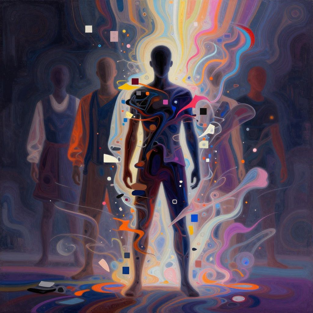 This digital art piece features a silhouetted male figure at the center, brightly illuminated from behind by swirling, vibrant colors including pink, blue, orange, and white. The figure's translucent, glitch-like overlay displays various digital elements like squares and lines. In the dark, blurred background, two indistinct, shadowy figures stand, one in a white shirt and brown dress, the other in a blue vest over a white shirt and brown pants. The scene has a surreal, abstract quality, with the central figure's glow creating an ethereal, almost otherworldly effect. The texture is smooth with a blend of neon and dark tones.