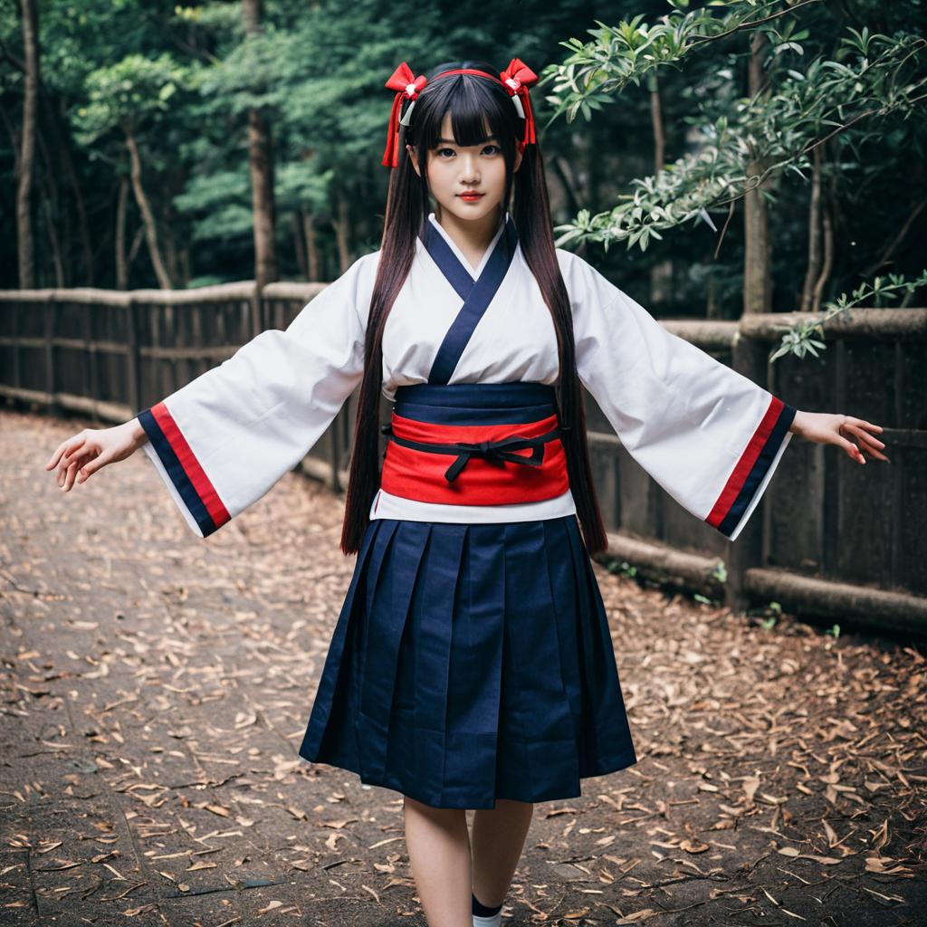 Photo-realistic full body portrait of a female cosplayer dressed as Amayadori Machi wearing a traditional Miko outfit with white kimono top and red and navy blue hakama skirt. The subject has long black hair styled in low twintails with red ribbons and blunt bangs. She stands on a leaf-covered pathway with a forested background, striking a posed stance with her arms extended.