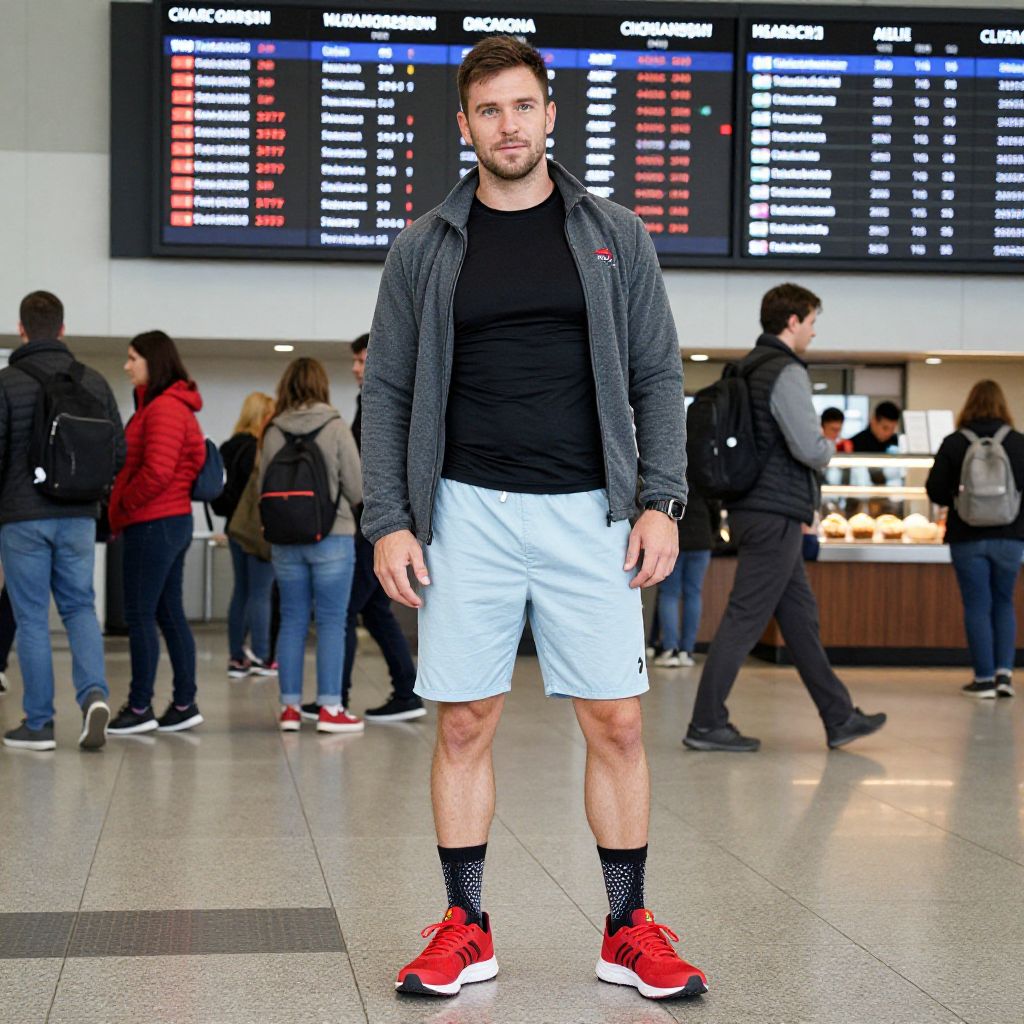 A man, lounge shorts in light blue, fitted black long-sleeve tee, gray zip-up fleece jacket, red running shoes, breathable ankle socks, terminal bustling with travelers, bright digital flight boards, aroma of coffee and pastries, cinecolor, relaxed expression, slight smile. Man has masculine face and piercing eyes