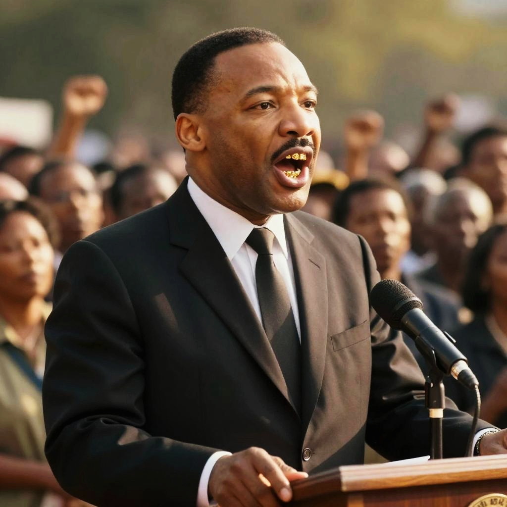 Powerful image of MLK gold teeth glistening as he delivers a passionate speech at a podium, surrounded by a crowd bathed in golden hour light, photorealistic style with detailed textures on clothing and skin, evoking hope and determination
