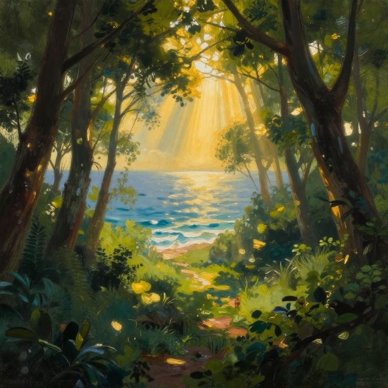 Imagine an enchanting dreamland where verdant woods meet vast seas, masterfully painted in a harmonious blend of chiaroscuro technique and impressionistic brushstrokes. From a high vantage point, observe the mystique of this extraordinary habitat as golden rays pierce through dense canopies, weaving intricate shadows upon gentle swells. This captivating tableau should inspire awe and contemplation, with rich hues and soft edges melding seamlessly to create an atmosphere of serene wonder and enigmatic allure.