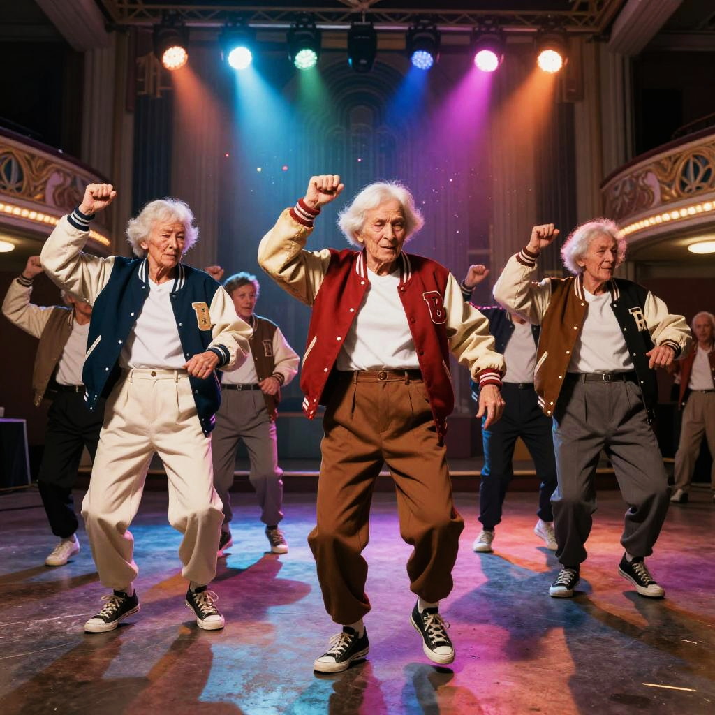A spirited group of elderly breakdancers with worn vintage varsity jackets, high-waisted slacks, and classic sneakers enjoys a lively party in an atmospheric abandoned Art Deco theater with dramatic spotlights and colorful dust motes, surrounded by vibrant colors and soft shadows.
