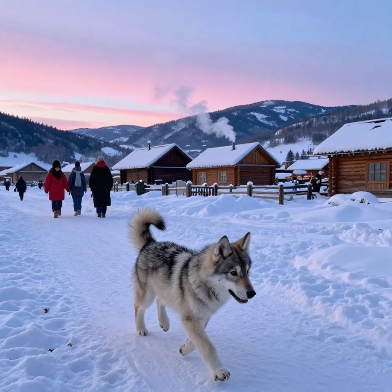 Photograph of a snowy village at dusk with a Siberian Husky in the foreground, walking on snow. The dog has a thick, gray and white fur coat with a bushy tail. In the background, several people in winter clothing, including red and black jackets, walk along a snow-covered path. Wooden cabins with snow-covered roofs are scattered across the village. Mountains with snow-capped peaks and a pink and blue sky fill the horizon. A small plume of smoke rises from a chimney, indicating warmth inside the cabins.