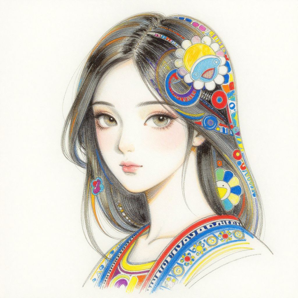 An abstract, colorful sketch of a woman with delicate features and intricate patterns, created by Takashi Murakami.