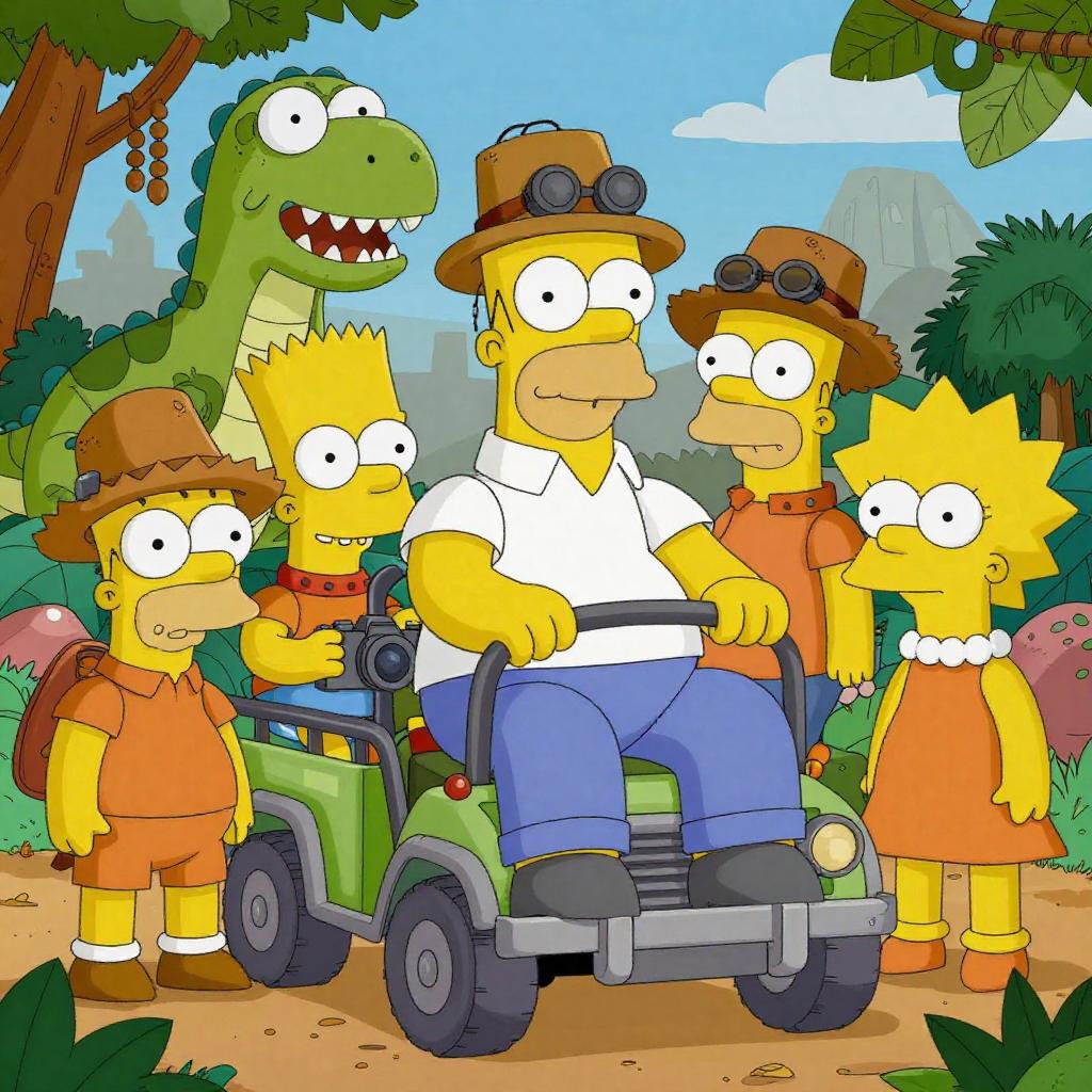 Illustration of The Simpsons characters dressed as explorers in a lush jungle setting. Homer Simpson is seated on a utility vehicle, surrounded by other family members including Bart and Lisa, along with a dinosaur figure. Characters are wearing explorer hats and holding cameras, emphasizing an adventurous expedition theme.