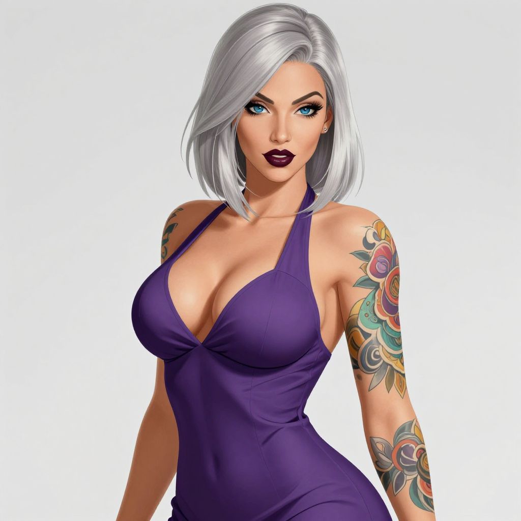 This is a digital illustration of a sexy woman with silver, chin-length hair and striking blue eyes. She's wearing a deep purple, low-cut dress that shows off her cleavage. Her left arm is heavily tattooed with colorful, intricate designs. She has dark red lipstick and a confident expression. The background is a plain, light gray, making her stand out. The style is realistic with a slight anime influence.