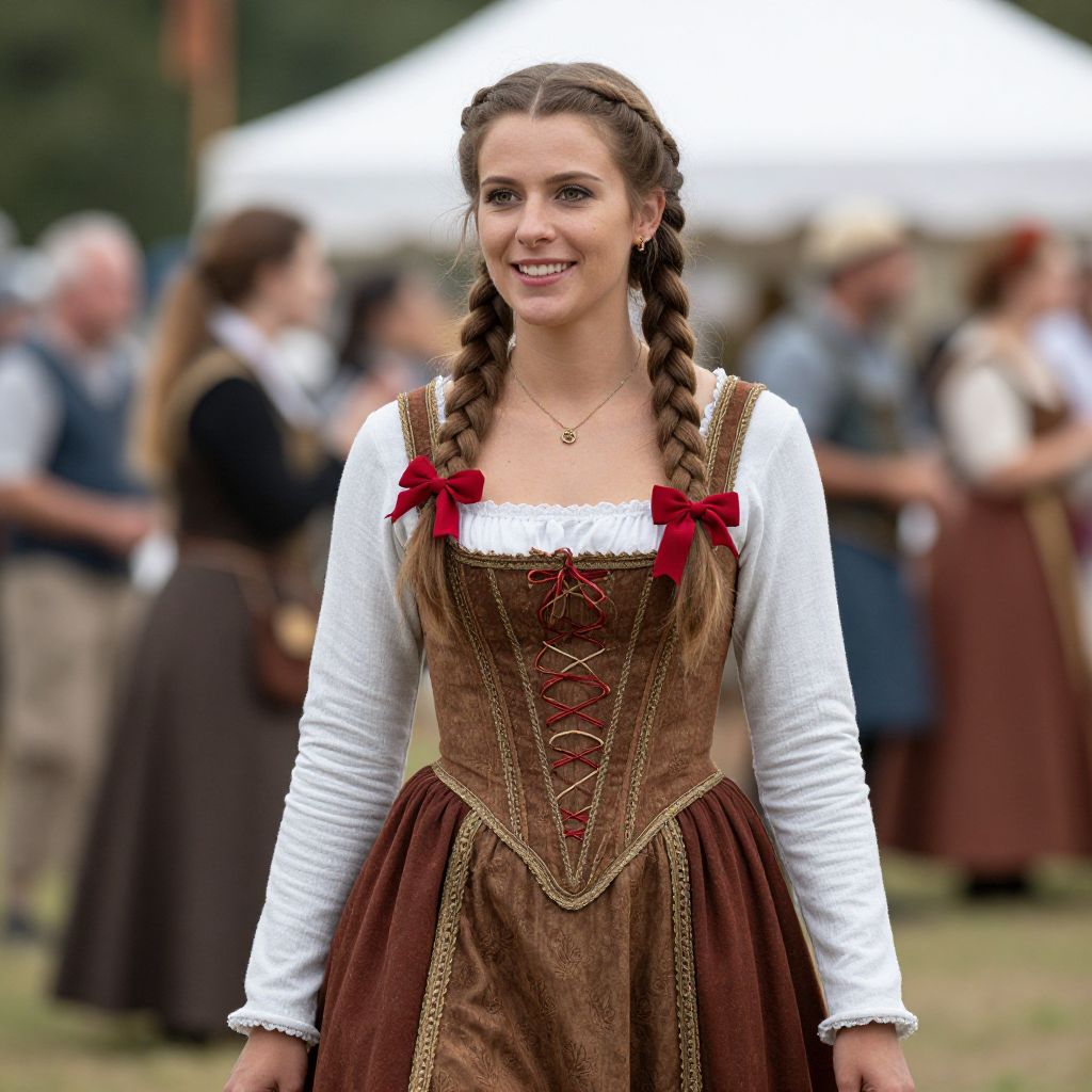 Renaissance Fair Costume Fairy, woman in a medieval dress with braids and a red bow