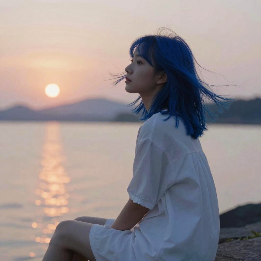 Red and black hair girl sitting on a rooftop during sunset, soft wind blowing her hair, serene expression, wearing a flowing black dress with red accents, loose painterly style, warm tones