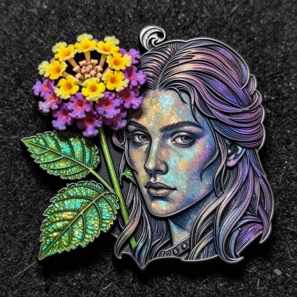 Line art trinket depicting a Lantana (flower)Odd Nerdrum, natural, shimmering, vibrant, gothic, rpg, 1400ad, ultra detailed, detailed, immersive, reminiscent of high fantasy RPG games, HD, masterpiece, best quality, hyper detailed, super realistic, perfect face, perfect hands, award-winning, professional, breathtaking, linquiveraconventional Cratercheerful weathertexture top down close-up