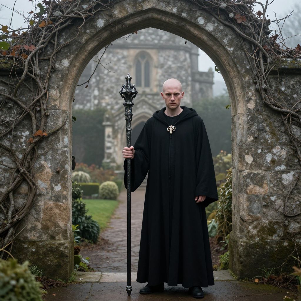 Photograph of a bald, stern-looking man in a black, long-sleeved monk's robe, holding a black, intricately designed staff with a decorative top. He stands in front of an old, weathered stone archway, overgrown with vines, leading to a misty, Gothic-style stone church in the background. The ground is a wet, stone pathway with neatly trimmed green bushes on either side. The man's robe has a small, ornate emblem on the chest, adding a touch of regality to his somber appearance. The overall mood is eerie and mystical.