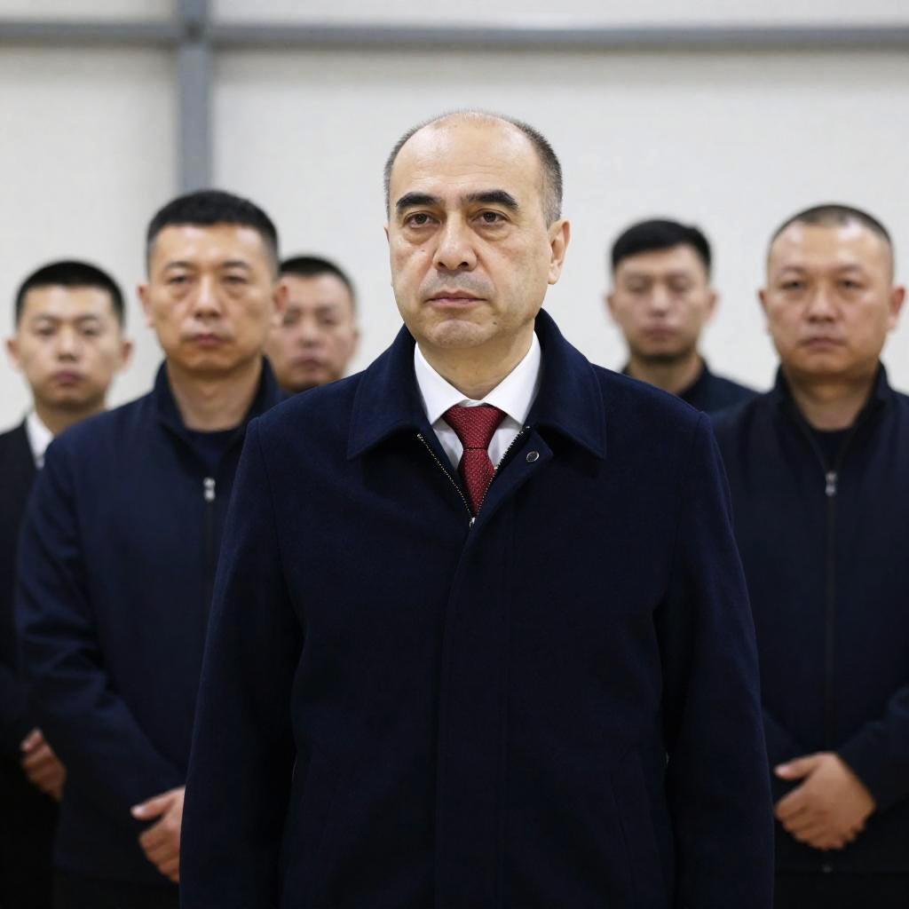 Photograph of a priest with a raised right hand, wearing a white robe, surrounded by people looking up from between green stone walls. Bare tree branches visible in the background. Priest's expression is intense. Eight people, diverse appearances, mostly serious expressions. Overhead perspective.