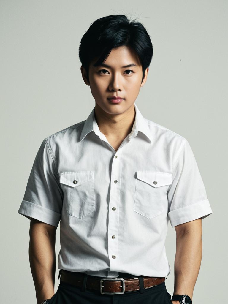 Professional clothes costume, 1boy, male focus, shirt, white shirt, watch, wristwatch, solo, pants, collared shirt, realistic, asian, black pants, black hair, arms at sides, short sleeves, closed mouth, looking at viewer, cowboy shot, short hair, standing