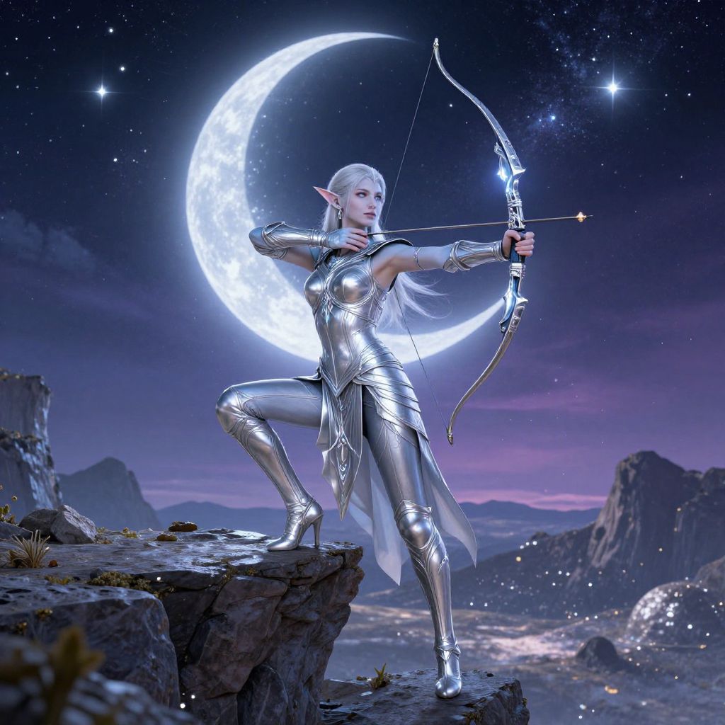 Ethereal elf archer in shiny silver armor stands on rocky cliff under glowing crescent moon, drawing bow in starry night sky. Digital art