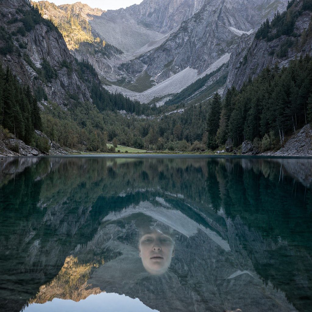 A serene mountain lake mirrors not just its surroundings, but the ethereal visage of a human face emerging from the depths, defying the boundaries between water and consciousness.
