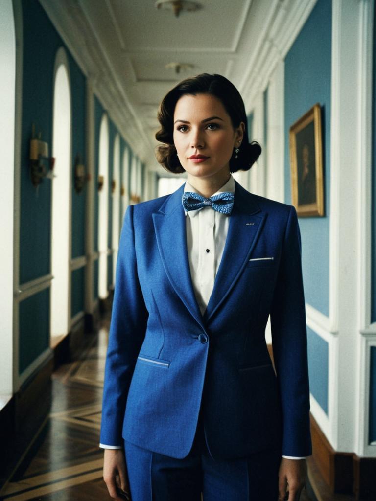 Woman Formal Clothes, woman in a blue suit and bow tie standing in a hall