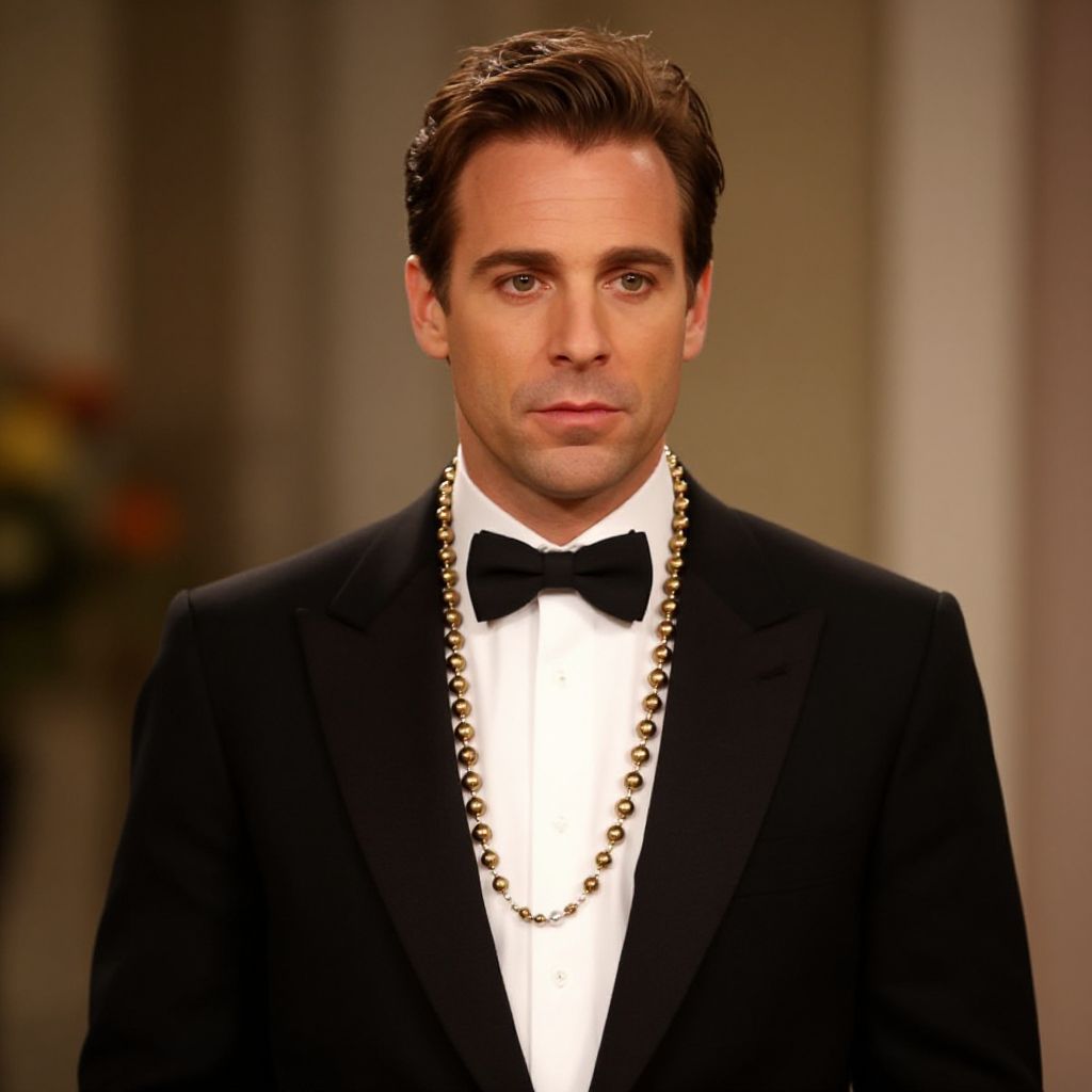 "Sitcom Fancy Dress, man in a tuxedo with a beaded necklace around his neck"