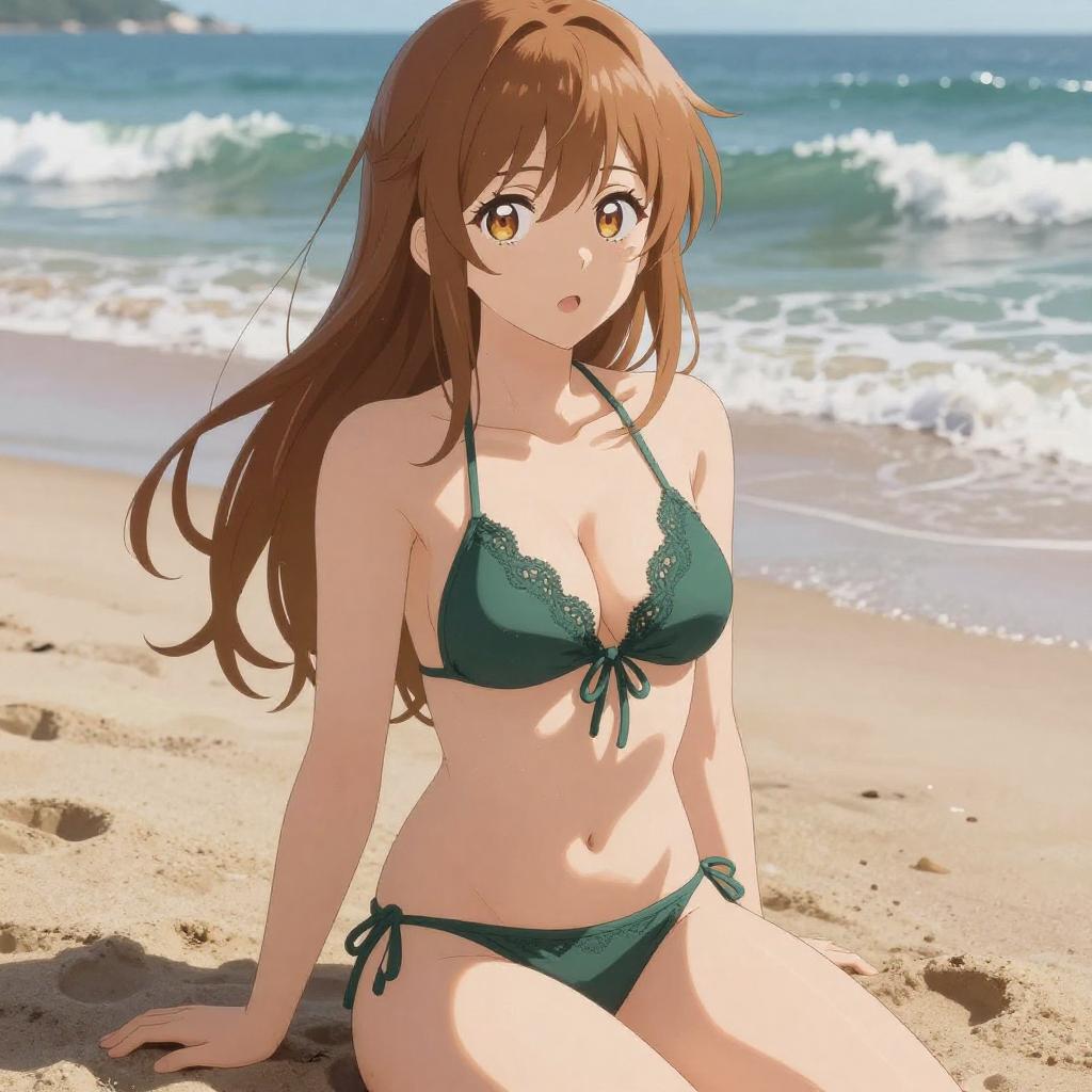 Digital anime-style illustration of a young woman with long, light brown hair and amber eyes, sitting on a sandy beach. She wears a dark green lace bikini, revealing a slim, toned physique. Her expression is slightly surprised, with sunlight highlighting her hair and casting shadows on her body. The ocean and waves are in the background.