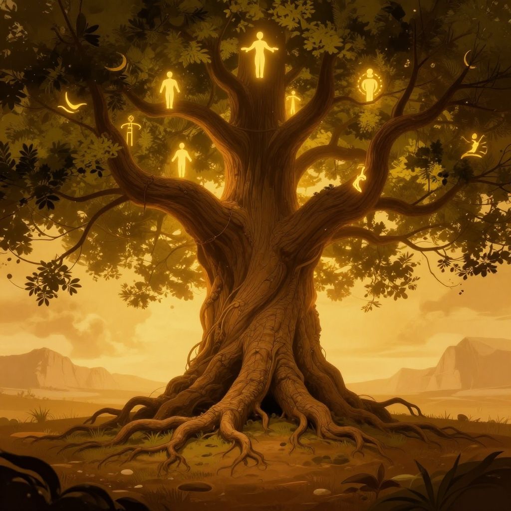 A majestic ancient tree symbolizing innate qualities rooted deeply in earth, branches glowing with symbols of wisdom and strength, fantasy illustration, warm tones.