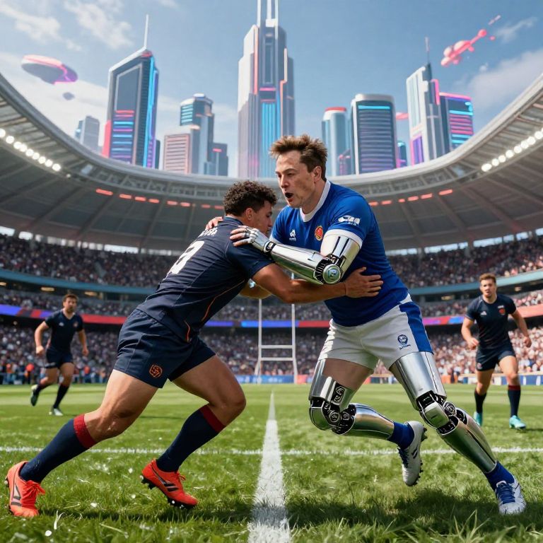 Elon musk rugby match, futuristic city skyline behind stadium, Elon tackling opponents with cybernetic enhancements, vivid colors and dramatic energy, cinematic perspective