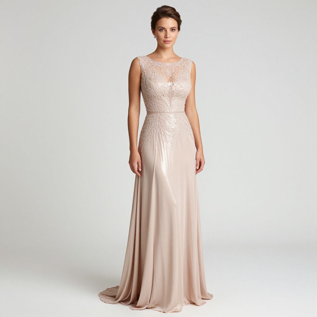 "Woman, classic elegance, A-line evening gown in a shimmering blush tone, sleeveless, illusion neckline with lace appliqué detailing, fitted bodice with beadwork and sequins, flowing skirt with a slight train, subtle keyhole back, simple stud earrings, white studio background. Sexy. Pretty face and beаutiful eyes. Big breasts."