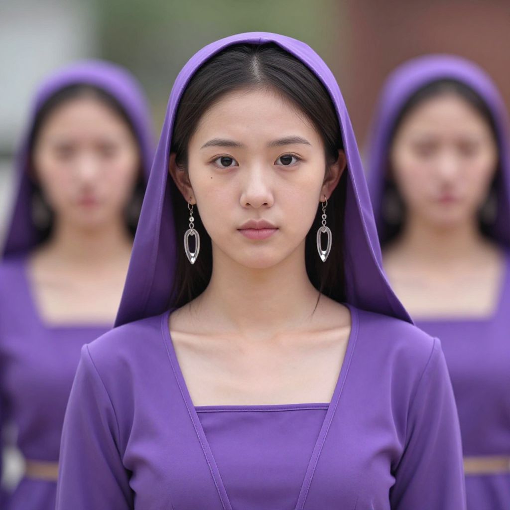 This photograph features a central young Asian woman with fair skin, straight black hair, and a calm expression, wearing a purple dress and a matching purple headscarf. She has large, silver, teardrop-shaped earrings. In the blurred background, two additional women with similar appearances and attire are visible, creating a sense of depth. The focus is on the central figure, with the background women slightly out of focus. The image has a soft, natural light, highlighting the women's serene faces and the rich purple of their clothing. The photograph has a realistic style with a slight digital enhancement.