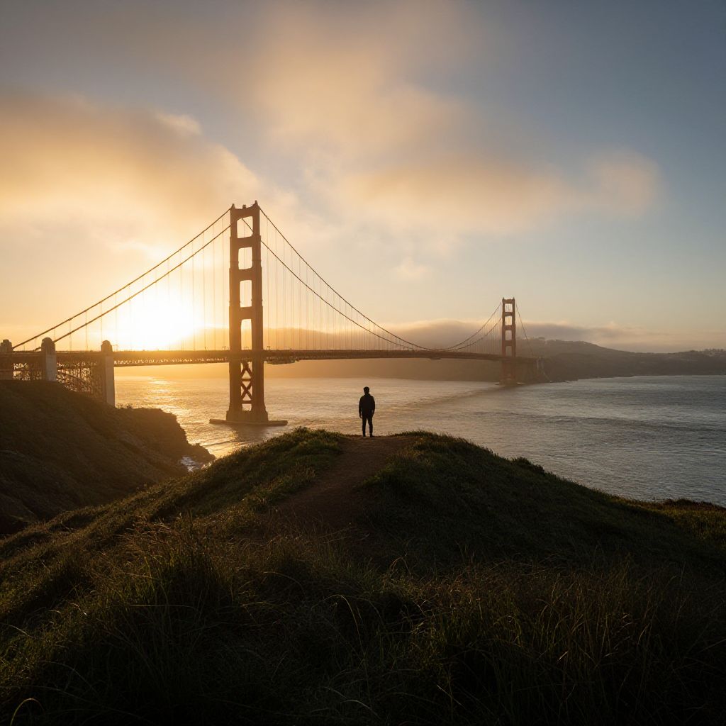 Panoramic landscape photograph, serene evening scene: A solitary figure stands at the crest of a grassy hill, gazing out towards the majestic Golden Gate Bridge, bathed in warm golden light as the sun sets behind it, casting long shadows across the San Francisco Bay, fog rolling in from the Pacific Ocean, dramatic cloudscape above, soft Man has masculine face and piercing eyes