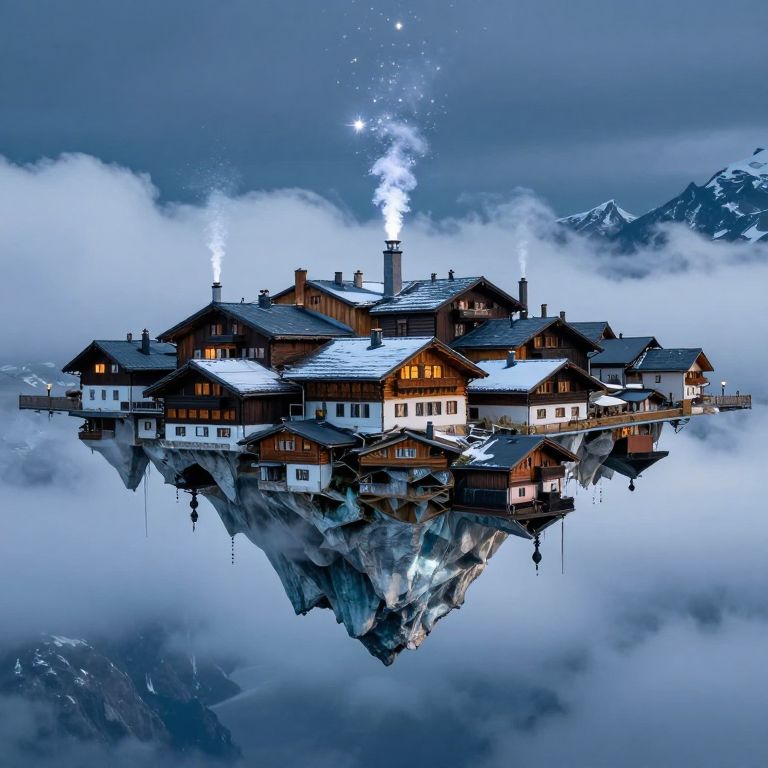An alpine village exists entirely upside-down beneath a floating glacier, with its rooftops brushed by clouds and chimneys exhaling starlight.