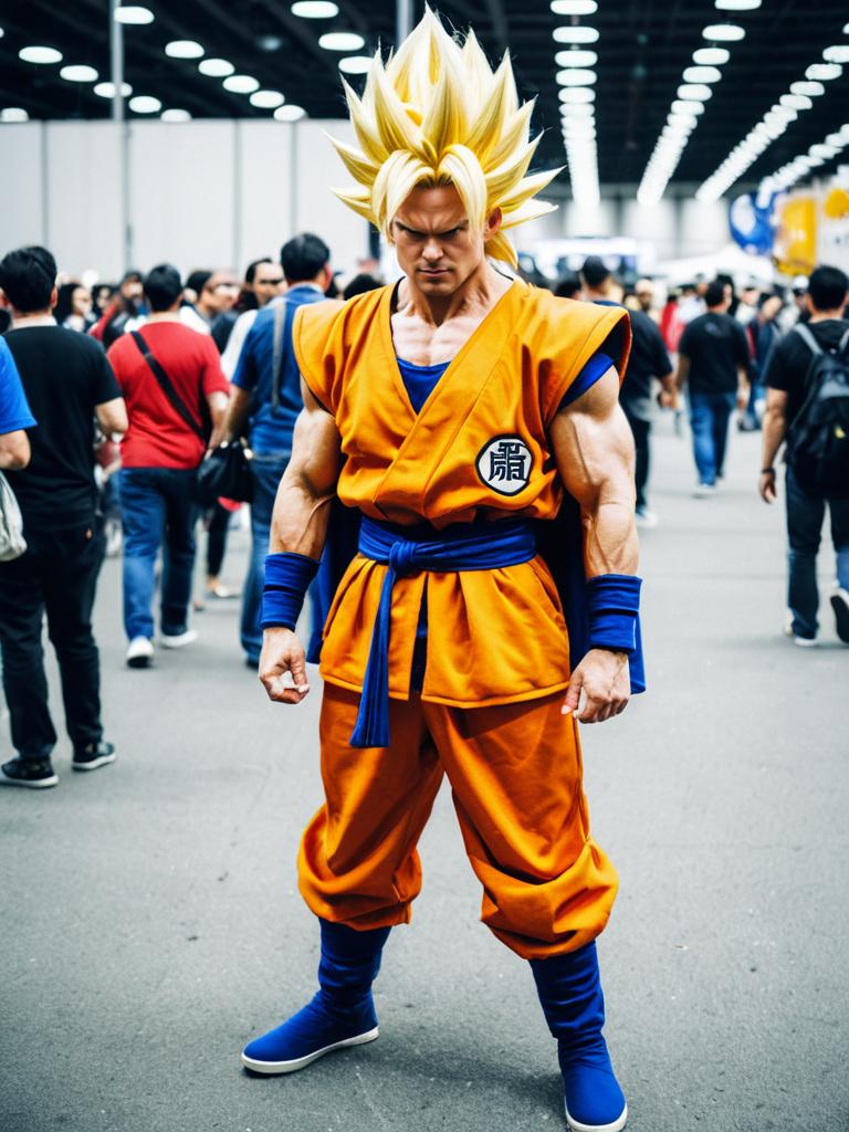 Man in Super Saiyan Costume, cosplay festival photo, photorealistic realism