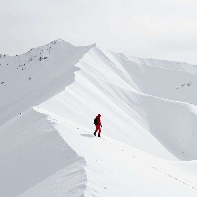 Digital artwork depicting a lone hiker in a red jacket and black pants standing in the center of a vast, snowy mountain landscape. The hiker is positioned slightly to the right of the image's center, surrounded by bright white snow with subtle shadows and texture. The background features jagged, snow-covered peaks on the left and right edges, creating a sense of depth and isolation. The image uses a high-contrast color palette with the red jacket standing out starkly against the white snow. The overall style is minimalist and modern, emphasizing the hiker's smallness against the expansive, icy environment.