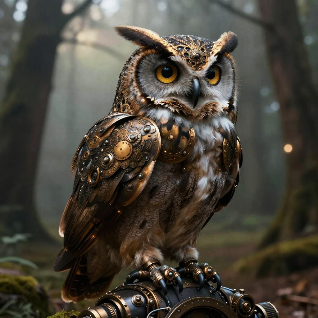 Ai blend images of wildlife morphing seamlessly with machinery, like a steampunk owl with intricate metallic feathers perched in a misty forest, combining realistic textures with fantasy elements, enhanced by dramatic shadows and warm glows