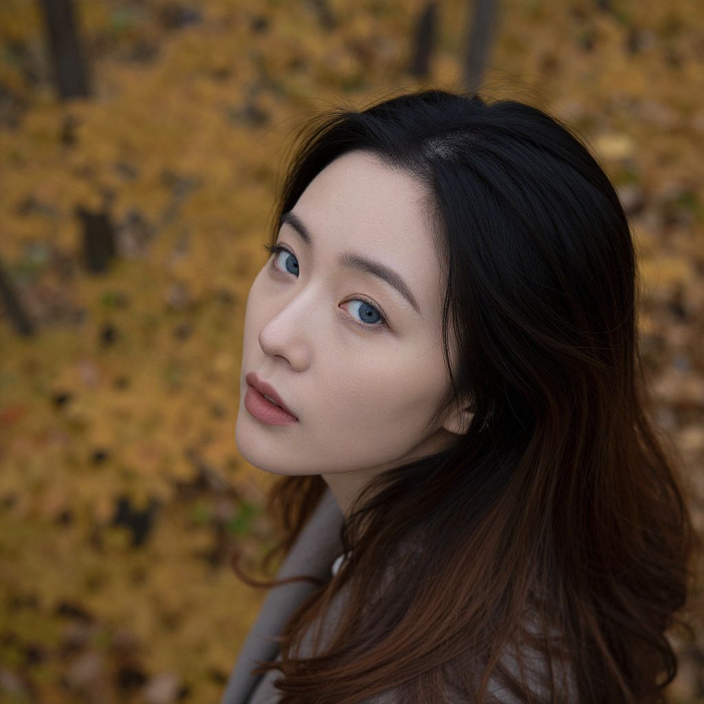 Photograph of an Asian woman with fair skin, blue eyes, and long black hair, gazing softly, set against an autumn forest background with golden