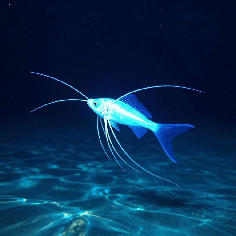 A luminous, otherworldly fish with elongated antennae and spindly appendages drifts serenely above a shimmering ocean, its body glowing against the backdrop of a star-studded night sky, defying the boundaries between sea and space.