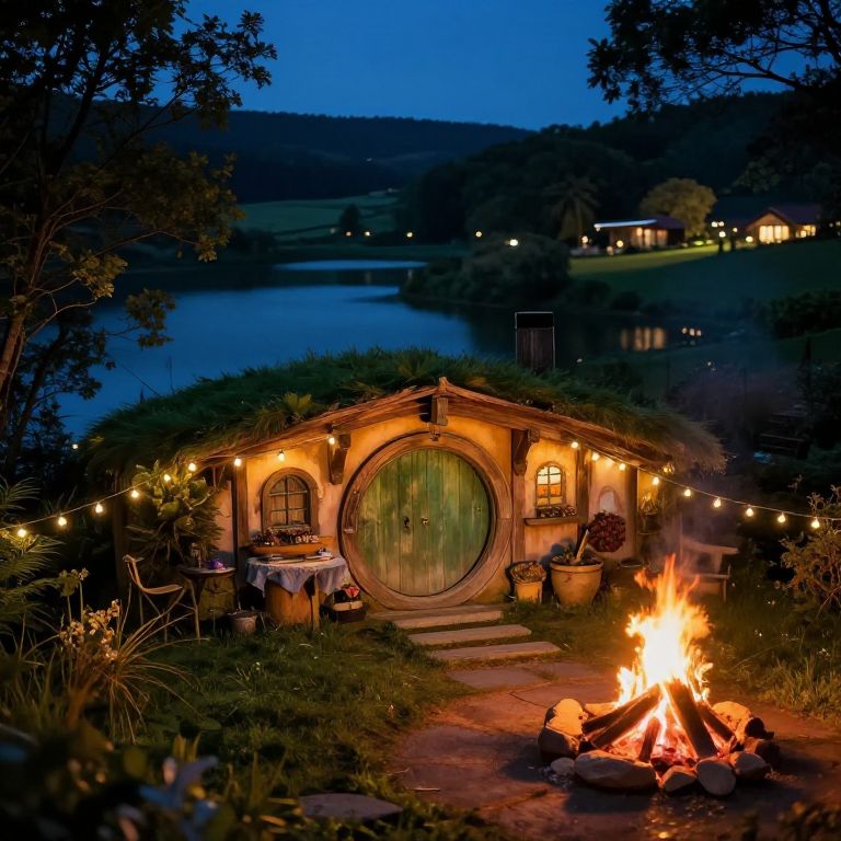 This photograph captures a whimsical hobbit house at dusk, nestled beside a serene lake. The round, green wooden door of the thatched-roof cottage is illuminated by warm, yellow string lights, creating a cozy ambiance. To the right, a vibrant campfire casts a flickering light, its flames dancing brightly. The house is surrounded by potted plants and a small stone path leading to the door. In the background, the dark blue twilight sky reflects on the calm lake, with silhouetted trees and distant houses adding depth. The overall scene evokes a sense of tranquility and enchantment.