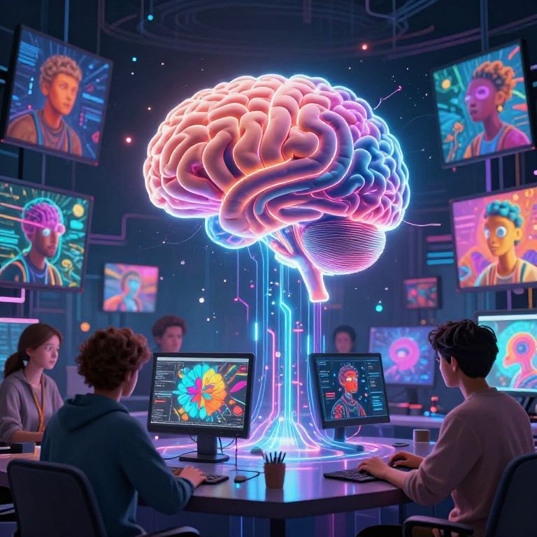 How are people making ai pictures: a conceptual scene of an AI brain connected to creative digital artists generating imaginative images, glowing data streams flowing from brain to screens, surreal and colorful atmosphere blending technology and creativity