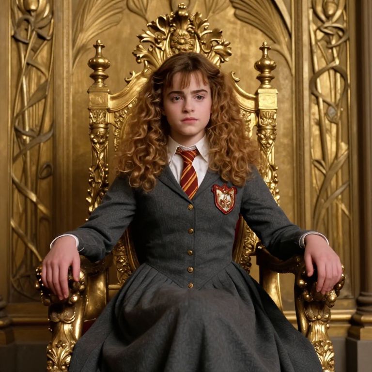 Hermione Granger a princess sitting in a golden sculptural throne. Behind her a golden wall decoration srt nouveau style,