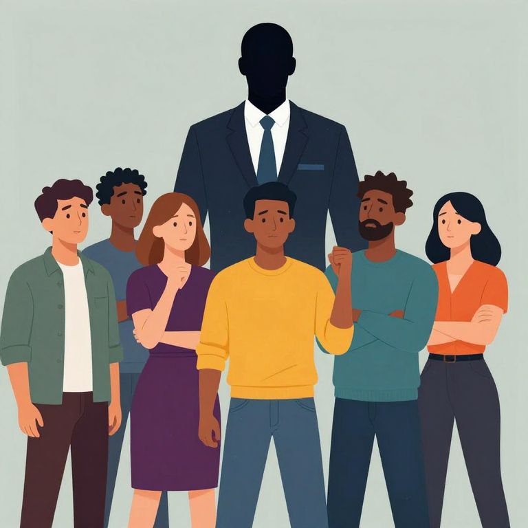 Unfair treatment illustrated by a group of diverse individuals facing an imposing, faceless authority figure, vibrant colors clashing with muted background, showing tension and injustice, expressive body language.