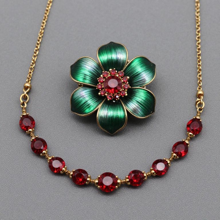 Green Enamel Flower Brooch with Red and Aurora Borealis Rhinestones #Vintage #fashion #brooches #necklaces #sets #bracelets #earrings #jewelry