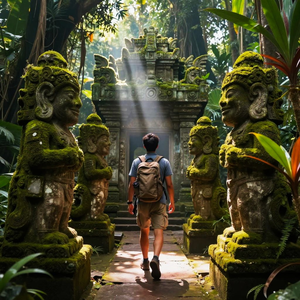 A photograph of a young, curly-haired Caucasian man with a lean build, wearing a white t-shirt, khaki shorts, and a black backpack, standing in a lush, sun-dappled jungle. He holds a detailed, yellow map with both hands and looks ahead. The dense forest features large green leaves, ferns, and a moss-covered ancient temple with ornate carvings in the background. Sunlight filters through the tree canopy, casting a mystical glow. The man's focused expression and adventurous attire suggest exploration.