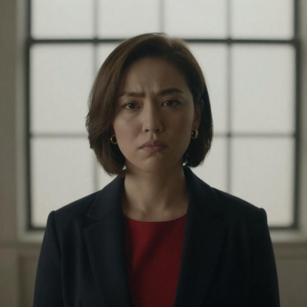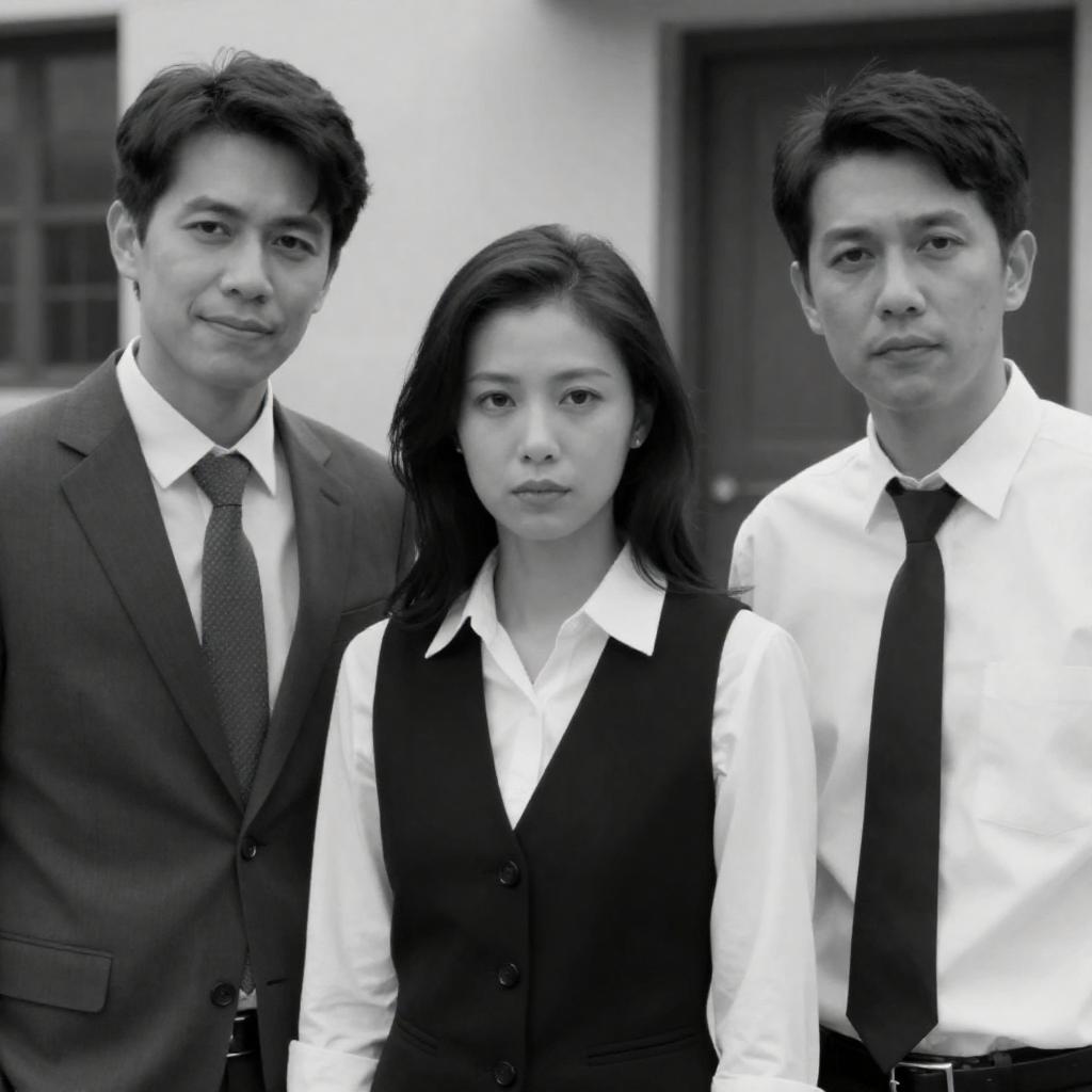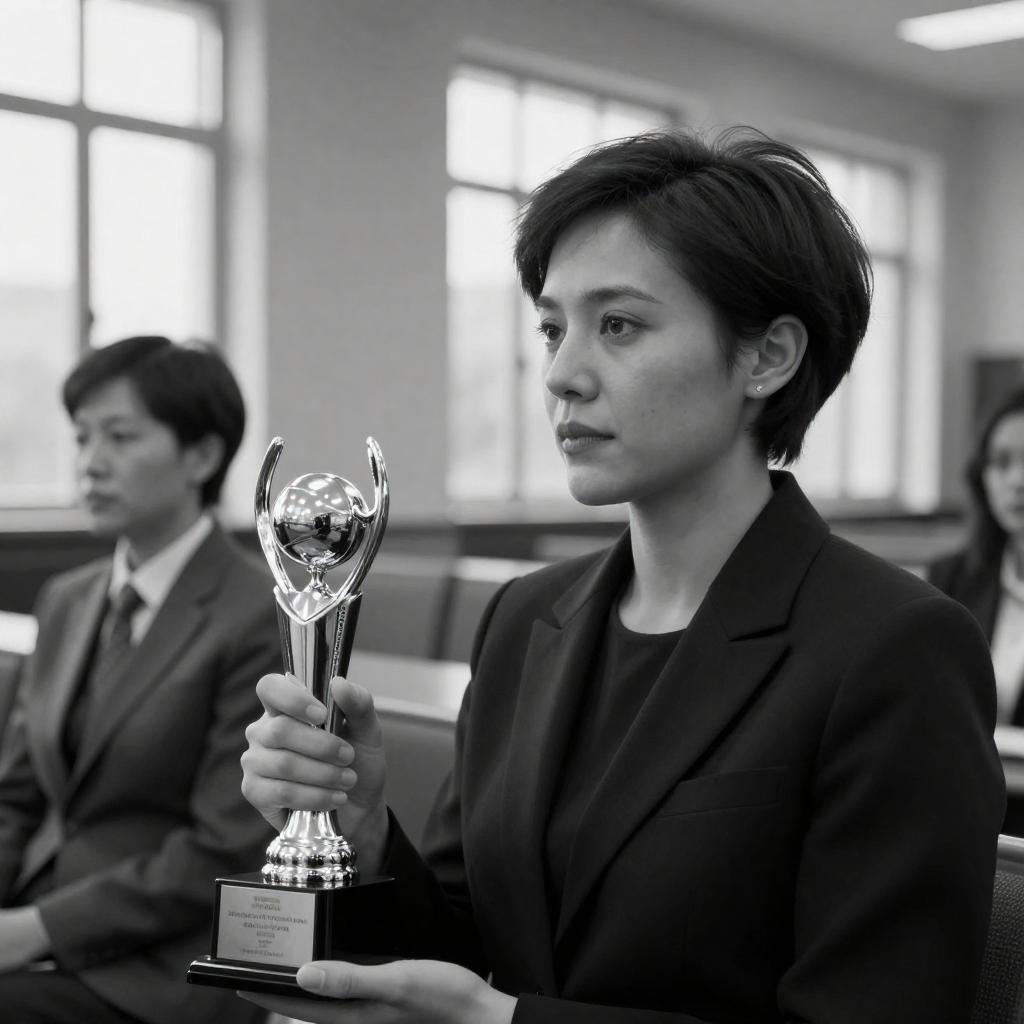 Black and white photograph of a woman with short, styled dark hair, holding a trophy in the foreground. She has a focused expression. In the background, a man in a suit and a woman with short hair are seated. The setting is an indoor hall with large windows and columns. The man looks ahead, and the woman appears to be looking down.