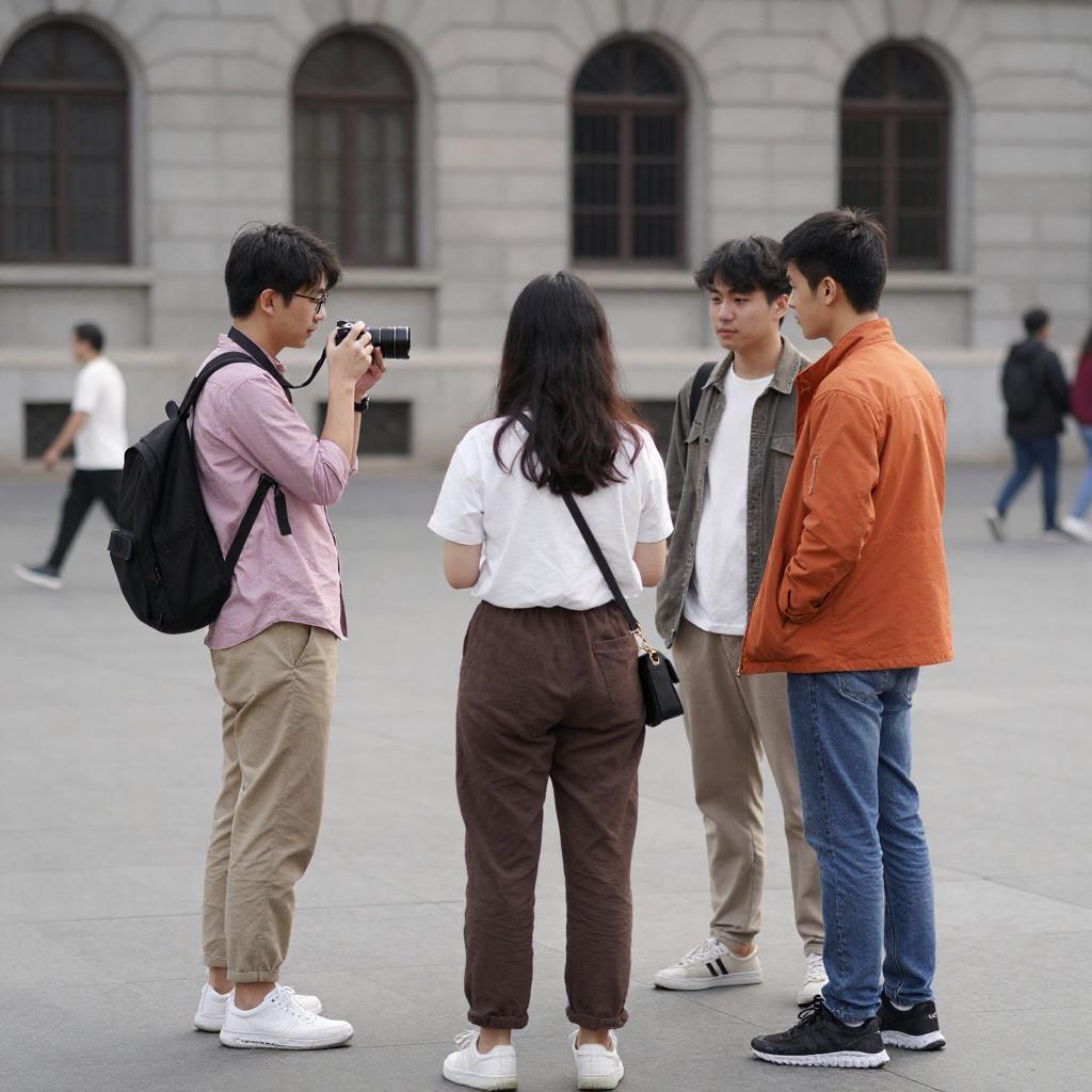 Photograph of a group in front of a historic building with an archway. A police officer in a black uniform points forward, a bearded man with glasses and a camera stands beside him, and three young people in blue denim jackets stand to the right. Trees and the building's stone facade are in the background.