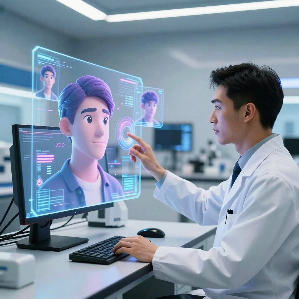 Expression changer technology in a sci-fi lab, scientist interacting with a transparent screen showing animated facial expressions, holograms of emotions swirling around, modern futuristic setting, sleek and clean design, blue and purple color palette