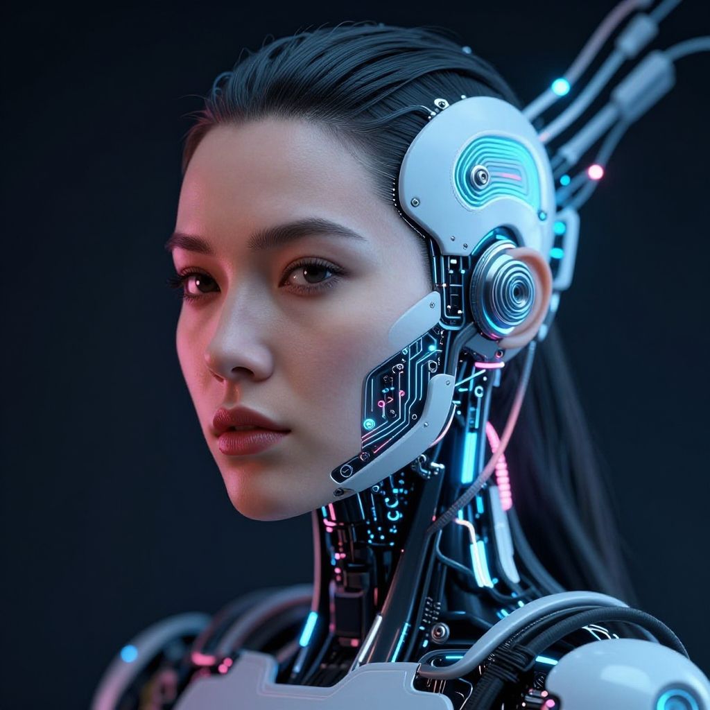 A futuristic portrait of a woman integrated with advanced cybernetic enhancements, featuring glowing neon cables and a sleek robotic design. The image blends hyper-realistic elements with a sci-fi cyberpunk aesthetic, highlighting the intricate details of her facial circuitry and technological components.